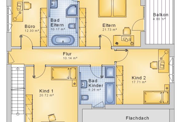 In diesem Haus bleiben keine Wünsche offen, denn die Raumaufteilung hat es in sich. Das Erdgeschoss ermöglicht neben Speisekammer, Hauswirtschaftsraum und Gästezimmer auch noch genügend Platz für eine Arbeitsecke. Das Obergeschoss bietet Platz für 3 Kinderzimmer oder ein weiteres Büro. Ein weiteres Highlight ist das Elternschlafzimmer mit eigenem Bad und Zugang zum Balkon.