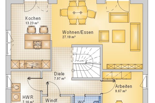 Bereits beim Eintreten überzeugt das Haus Wien durch seine weitläufige und wohnliche Raumaufteilung. Zusätzlich macht die Dachabschleppung mit Erker das Haus geräumiger und wertet von außen die Traufseite auf. Ein großer Hauswirtschaftsraum und ein Arbeitszimmer ergänzen das Angebot im Erdgeschoss. Im Obergeschoss sorgen ein Elternschlafzimmer mit Ankleide, zwei Kinderzimmer und ein Bad für eine Fülle an Wohnkomfort.